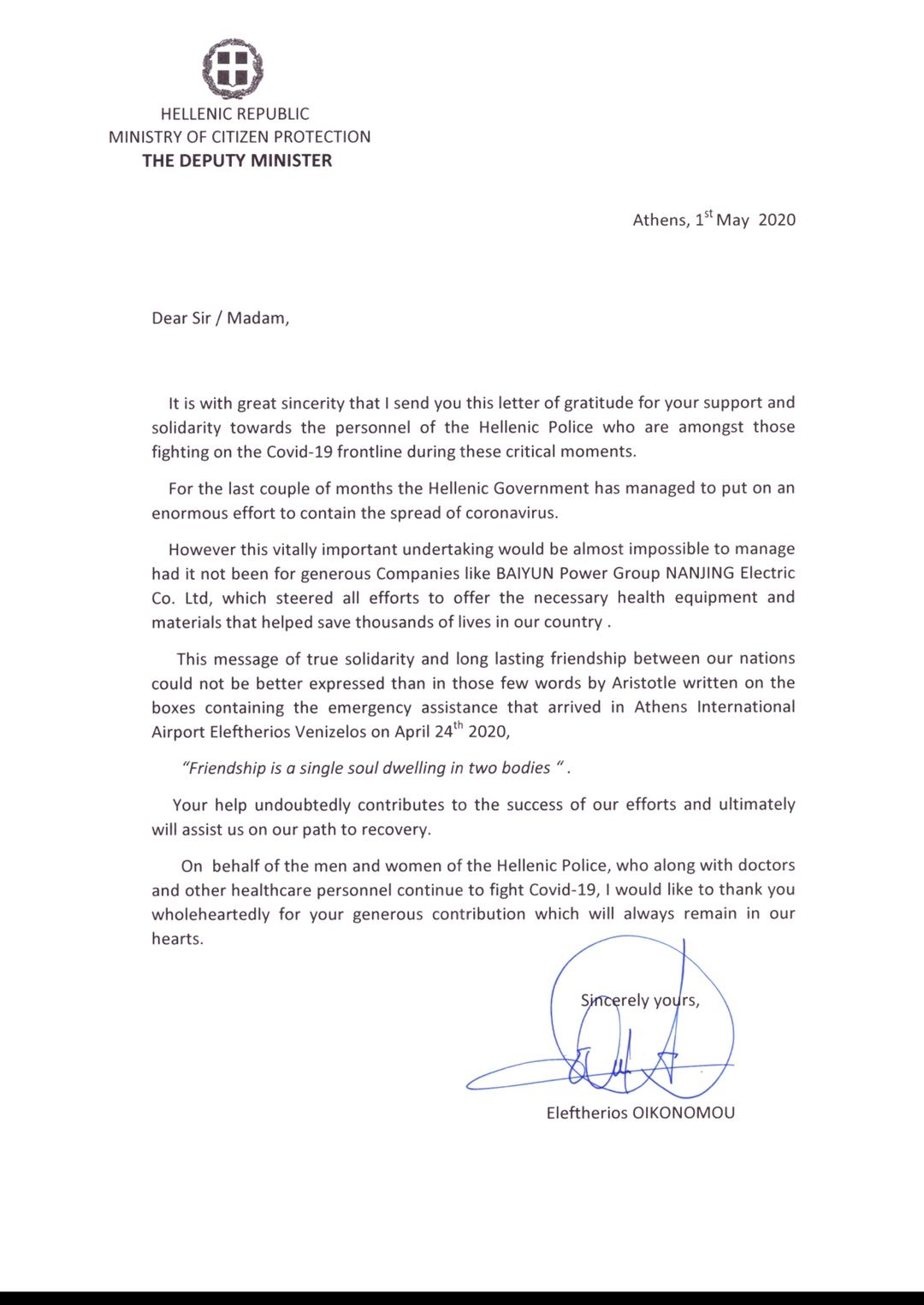 2020年5月1日,希臘共和國公民保護(hù)部副部長Eleftherios OIKONOMOU先生于雅典向南京電氣發(fā)出感謝信,對南京電氣在新冠肺炎疫情防控中對希臘安全與警察部門及時提供支持幫助表示感謝。 感謝信說,作為在抗擊...