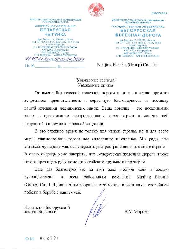 2020年5月11日,白俄羅斯鐵路長官弗拉基米爾•莫洛佐夫先生代表白俄羅斯鐵路部門,向南京電氣發(fā)出感謝信,對南京電氣向白俄羅斯鐵路局提供防疫物資支援表示感謝。 感謝信說,在當(dāng)今疫情防控特殊時期,...
